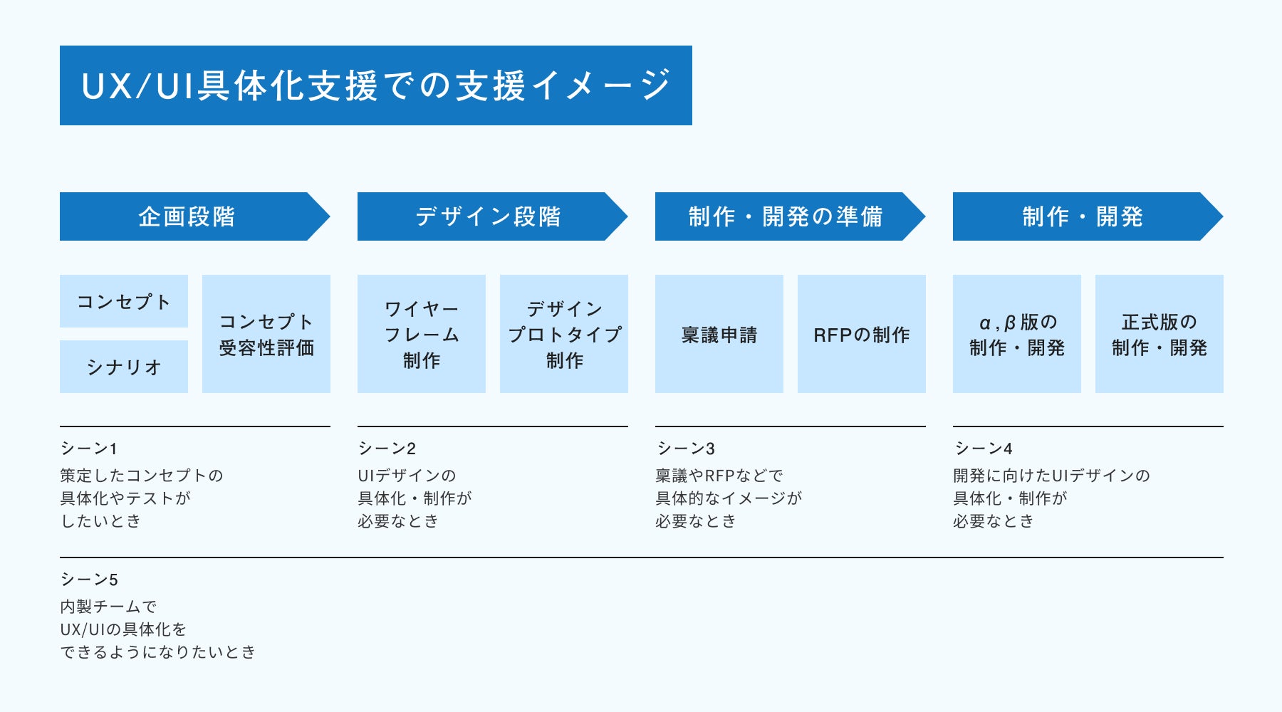 - 実際のサービス開発におけるUX/UIの具体化だけでなく、社内での稟議やユーザーテストのための素材など、サービス実現のために必要な具体化のご支援も可能です