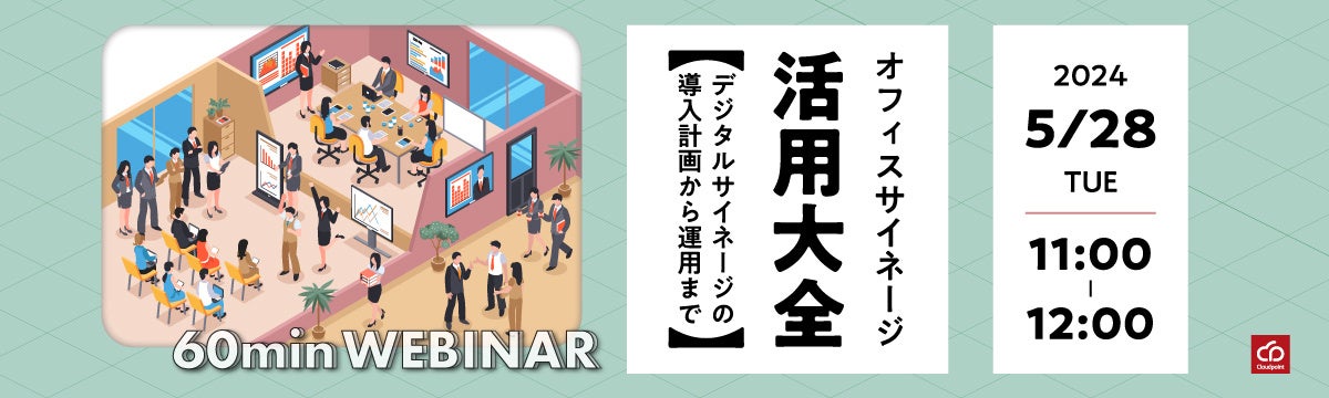 ペイクラウドホールディングス株式会社(東証グロース:4015)の傘下でデジタルサイネージ関連事業を展開する株式会社クラウドポイント(本社:東京都渋谷区、代表取締役:三浦 嚴嗣)は、近年導入が増えているオフィスでのデジタルサイネージ活用について、導入計画から運用まで事例も含め一度に知ることができるウェビナーを5月28日(火)に開催いたします。
