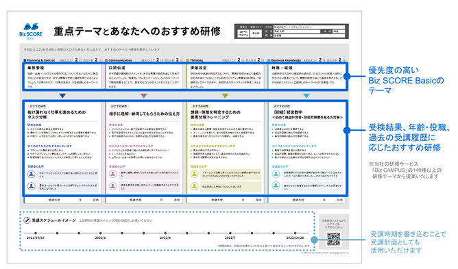 また、「Biz SCORE Basic」では、これまでの10万人以上の受検データを踏まえ、各カテゴリの結果スコアの傾向や受検開始前の自己分析結果データなど、独自のアルゴリズムにより個々人の課題を抽出。その上で、優先して取り組むとよい重点テーマ、おすすめ研修を自動表示する「研修レコメンド機能」を搭載しています。こちらも2021年に特許を取得しました。