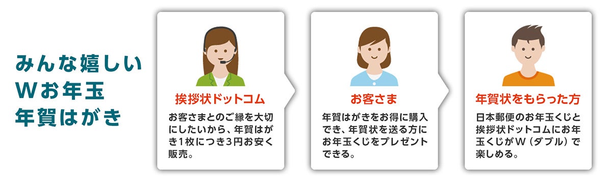 Wお年玉年賀はがきは、お客様が3円安く購入でき、年賀状を受け取られた方も日本郵便のお年玉くじと、挨拶状ドットコムのお年玉くじの両方をW(ダブル)で楽しめる点が特徴です。