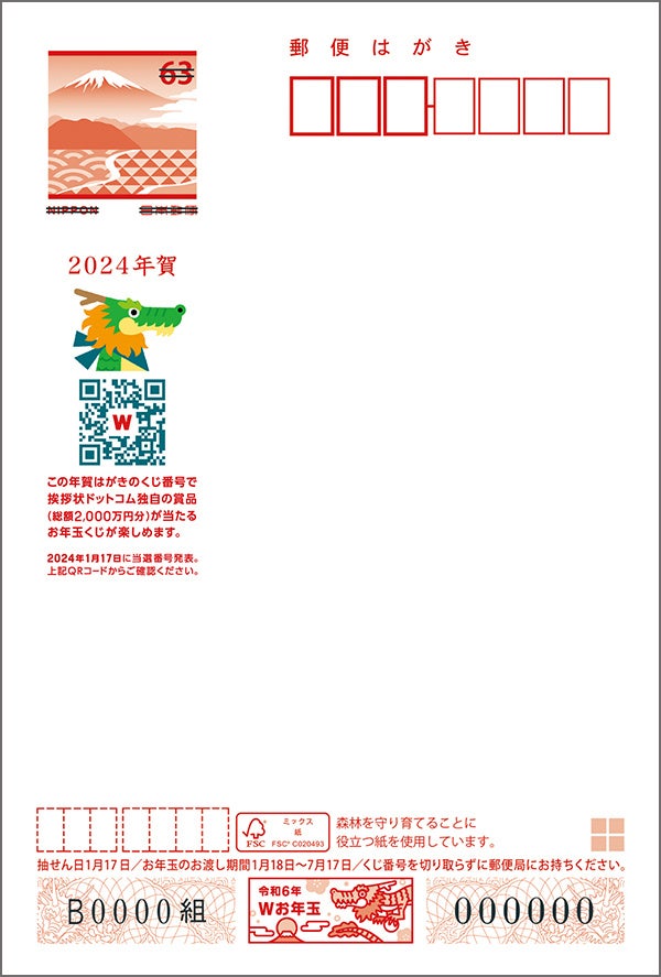 Wお年玉年賀はがきは、挨拶状ドットコムのグループサイトではがき印刷サービスをご注文いただいた方にのみ、380万枚限定で購入が可能。Wお年玉年賀はがきのみの販売は行っておりません。
