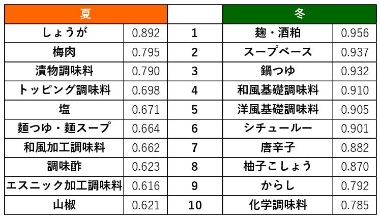 図2 季節(夏・冬)との関連性が高い調味料トップ10