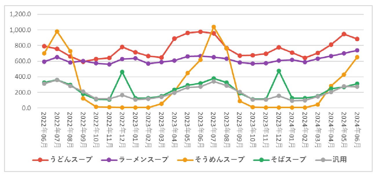 「ラーメンスープ」は年間を通じて大きな変動は見られませんが、「うどんスープ」は3月頃から上昇し、8月までの暑い時期に山なりになっています。「そうめんスープ」は7月にピークとなる急勾配な山になり、「そばスープ」は特に12月の指数が高いことがわかります。