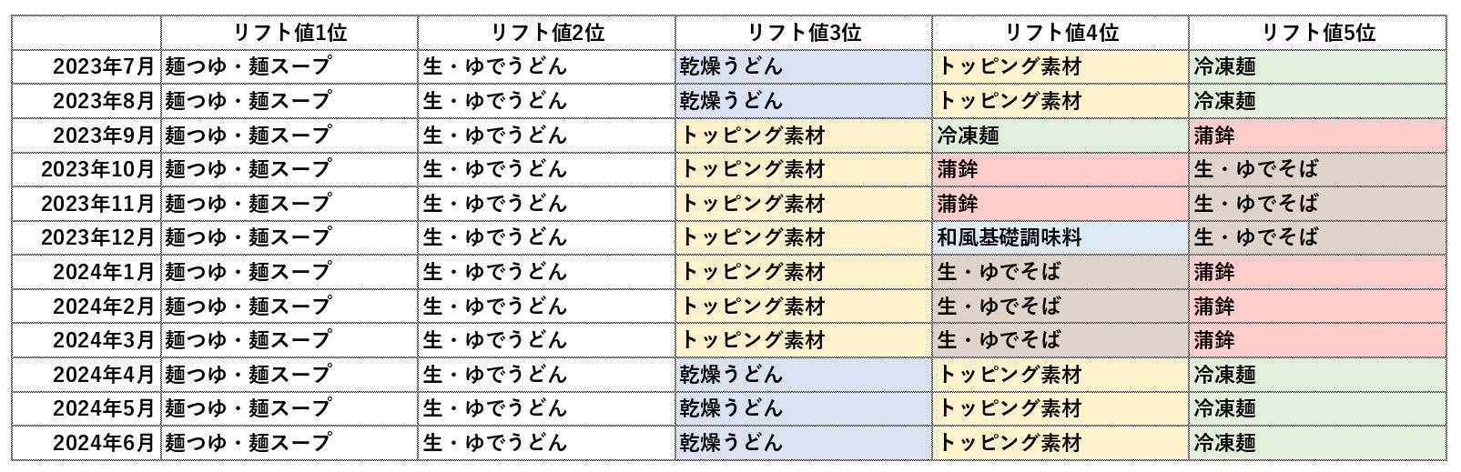 リフト値の各月上位5位をみると、1位「麺つゆ・麺スープ」(「うどんスープ」以外)、2位「生・ゆでうどん」には季節性はみられませんが、3位以降は、4~8月は「乾燥うどん」が3位、「冷凍麺」が5位みられるのに対し、9~3月は天かすやフリーズドライの天ぷらなど「トッピング素材」が3位、「蒲鉾」や「生・ゆでそば」が4位・5位にみられるなど、季節による違いがみられました。