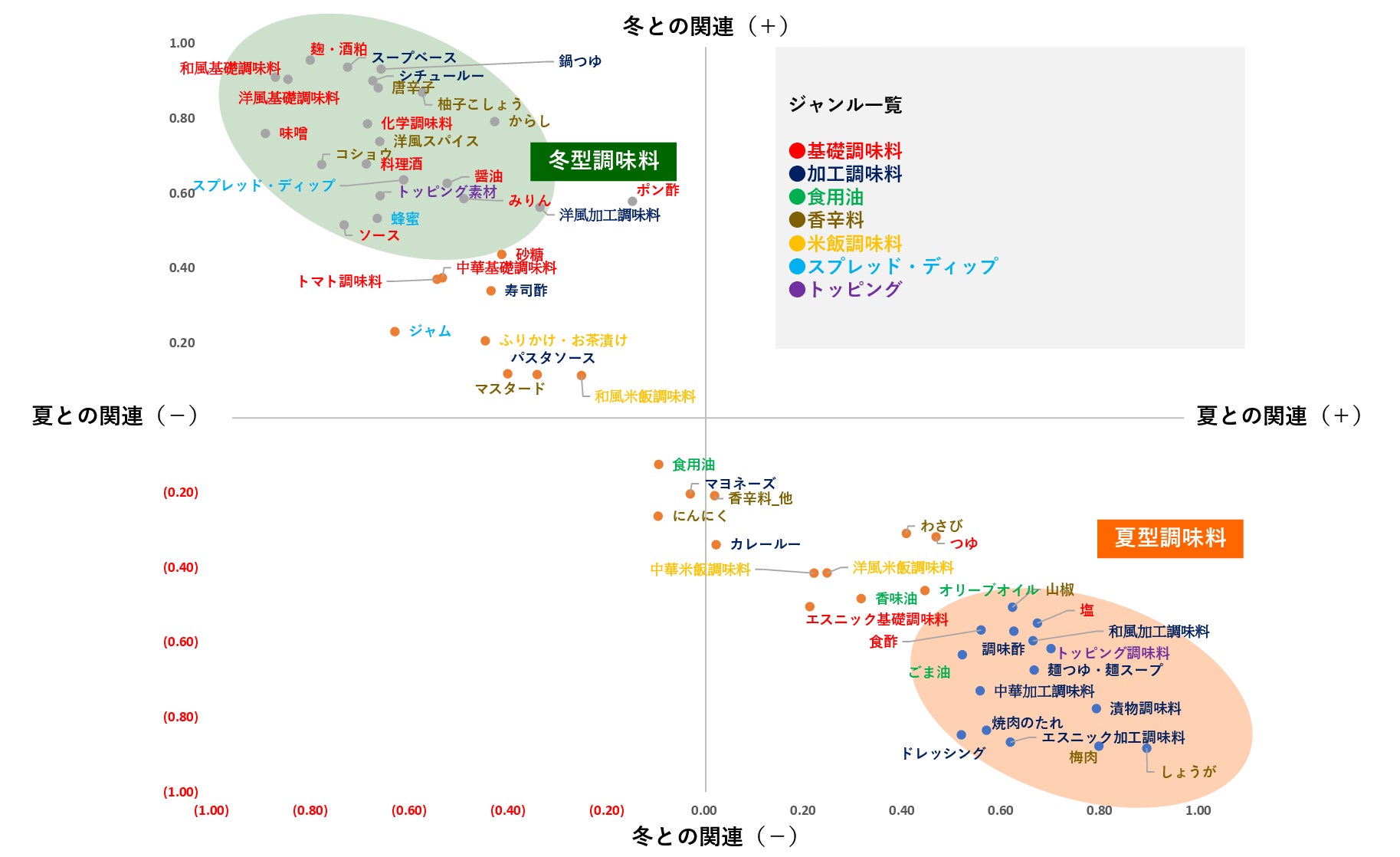 夏に売上高が高くなる「夏型調味料」と冬に売上高が高くなる「冬型調味料」に分類できる