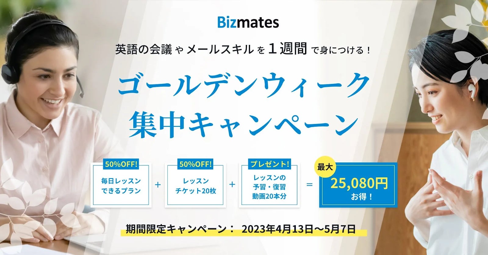 新年度がスタートし、「新しいスキルを身につけたい」「新たに何かを始めたい」と考えているビジネスパーソンも多いのではないでしょうか。ビズメイツが提供するビジネス特化型英会話「Bizmates」では、ゴールデンウィークを活用して、効率よく実践的な英語力が習得できる「ゴールデンウィーク集中キャンペーン」をご用意いたしました。