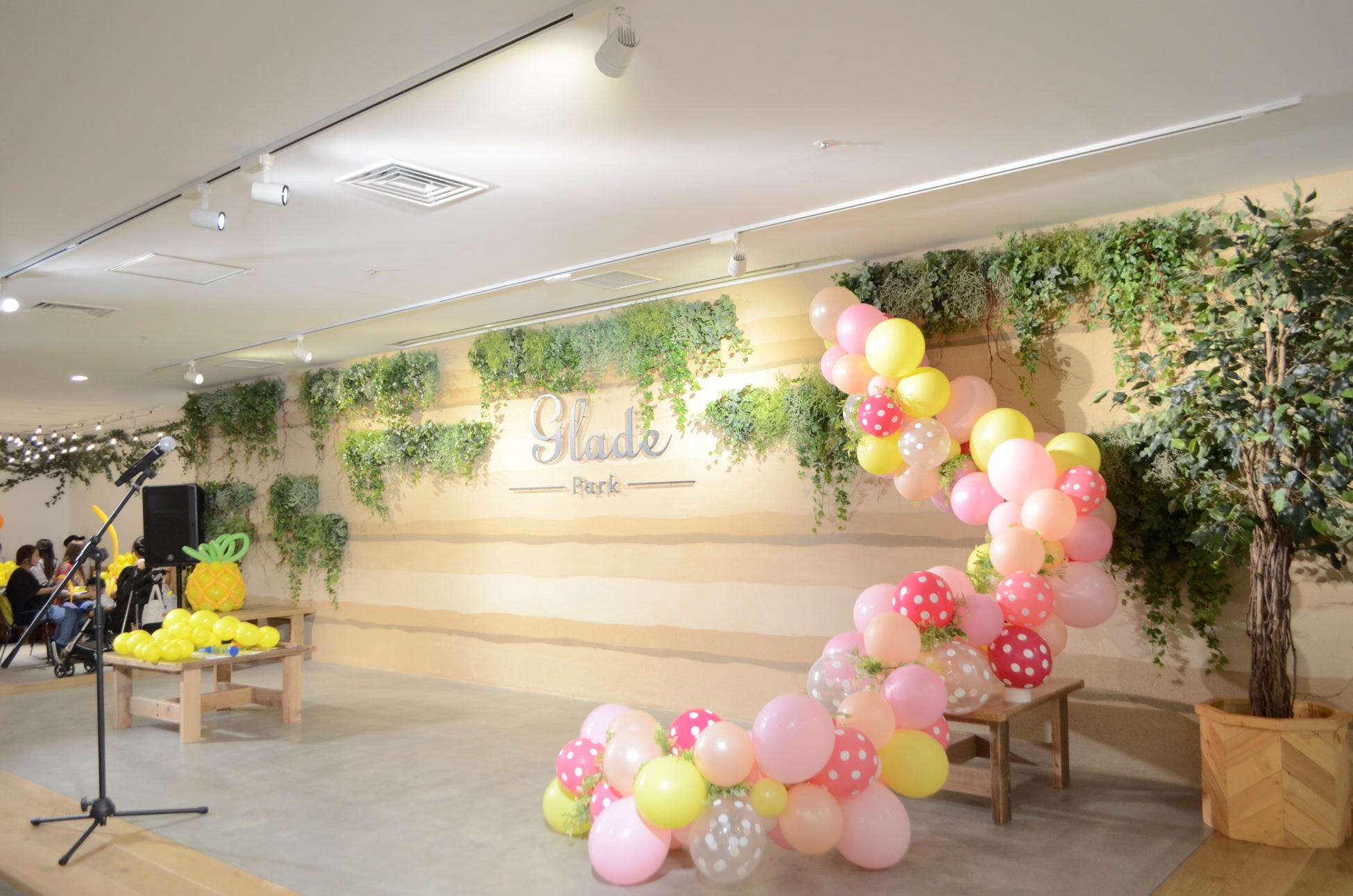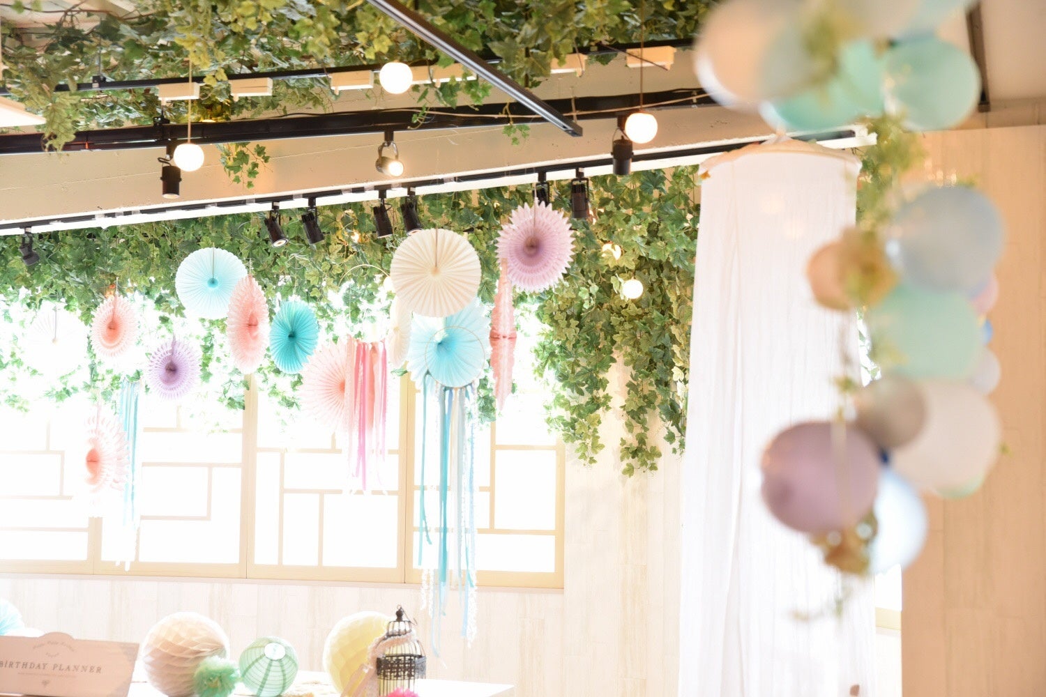 会場に常設されているフェイクグリーンに合わせたパステルカラーの装飾を行いました。