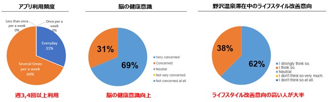 今回、参加者の方は週3,4回以上の頻度でアプリを利用いただき、野沢温泉の脳の健康によい観光体験や、脳に良い行動の健康管理を実施いただきました。その結果、脳の健康意識が向上し、野沢温泉滞在中のライフスタイル改善意向が向上したことがわかりました。