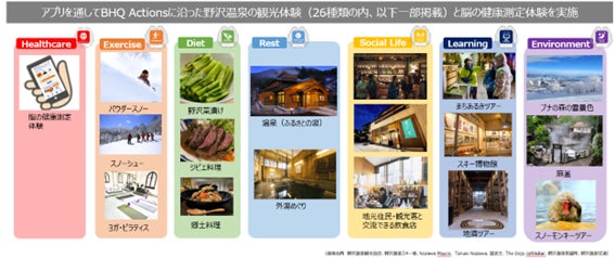 ・実施内容: 野沢温泉村滞在期間中に、BHQ Actionsを網羅した脳の健康維持増進アプリの利用(2週間以上)を通じて野沢温泉村の脳の健康に良い観光体験と脳の健康管理を実施し、その利用前後でアンケート調査を実施。
