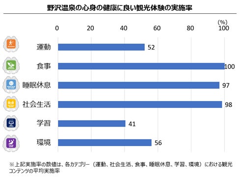 野沢温泉の脳の健康に良い観光体験の実施状況について、「食事」「睡眠休息」「社会生活」の観光体験は実施率が高く、一方で「運動」「学習」「環境」の観光体験は実施率が比較的低い傾向がみられました。