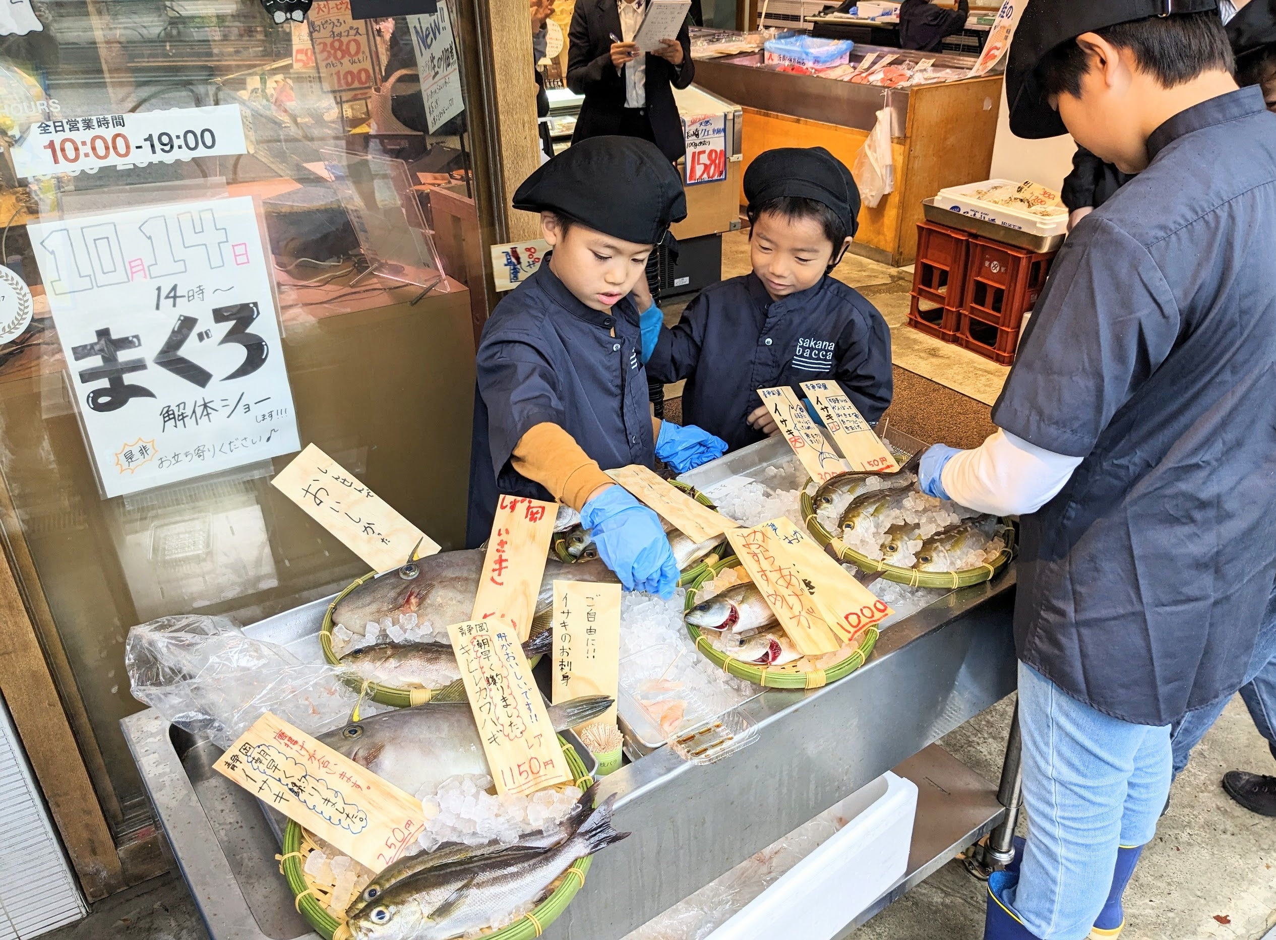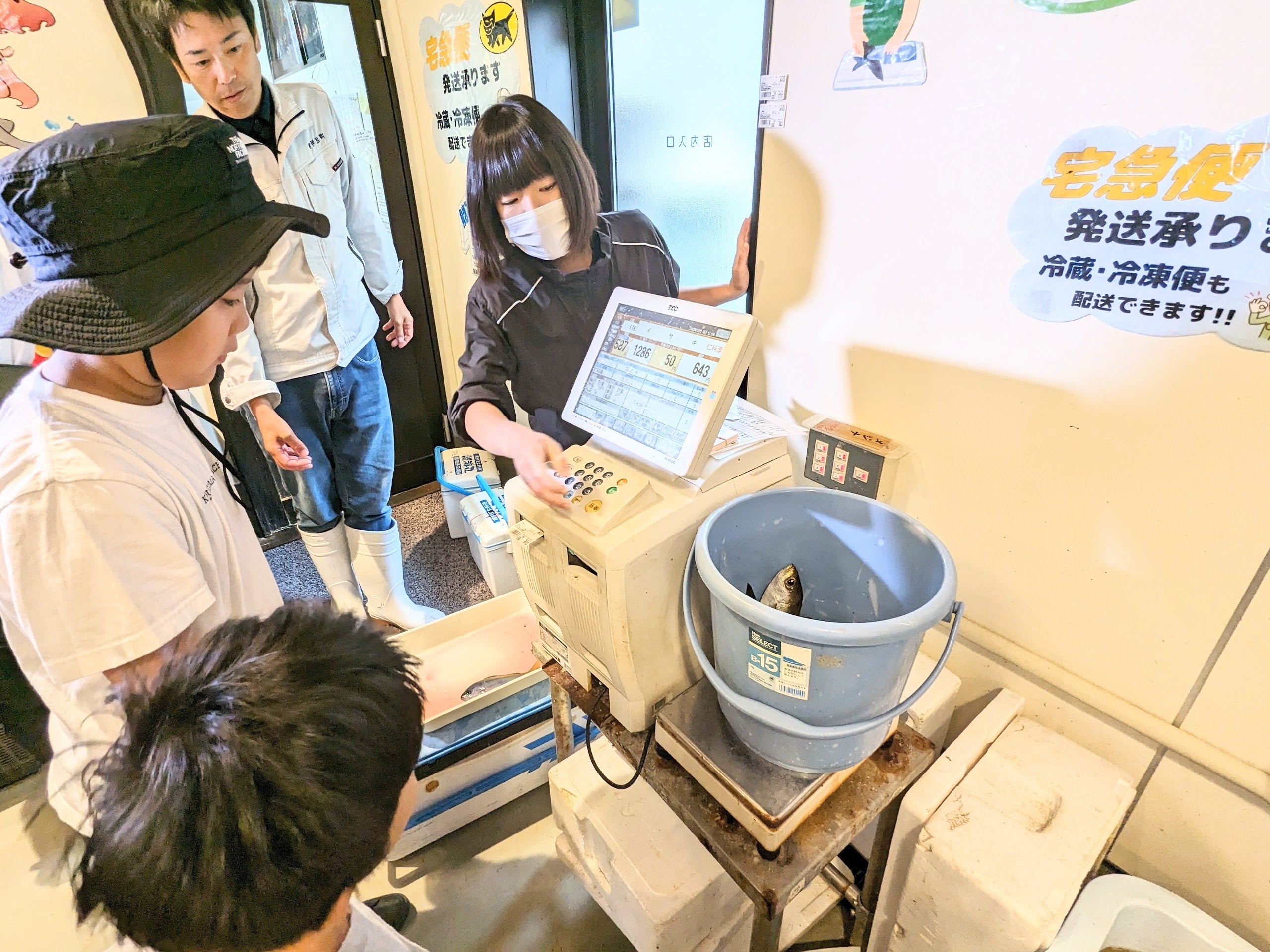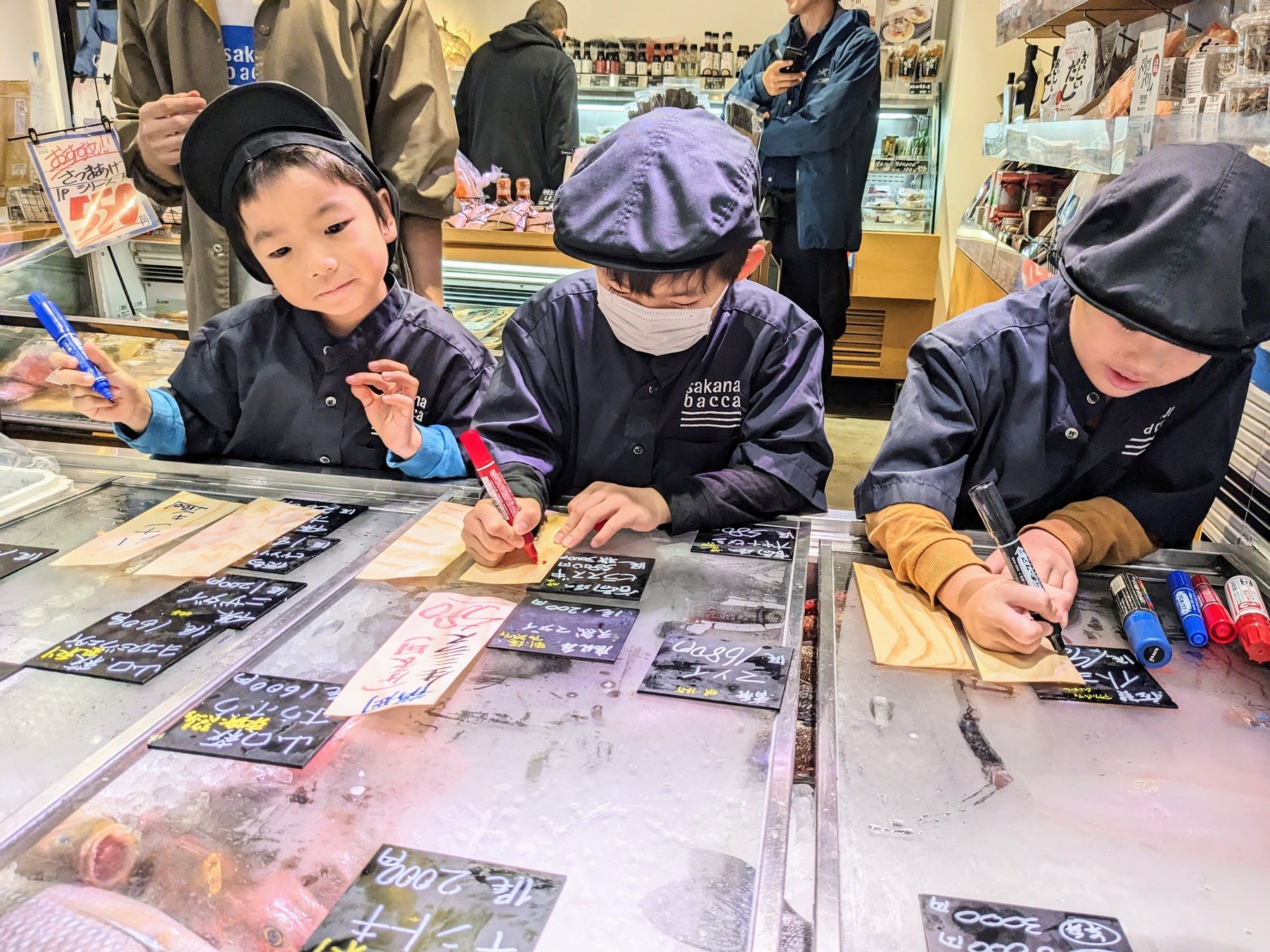 正午にサカナバッカ中目黒へ再集合し、サカナバッカのユニフォームに着替えて接客・販売体験へ。自分で釣った魚の魅力を、各々がPOPで表現しました。魚のサイズや在庫の状況によって価格を変更するなど、子どもたちが独自の工夫を凝らす姿が印象的でした。「商売の楽しさと大変さがわかった」と子どもたちが話してくれ、保護者の方たちからは「こうした体験をまた企画してほしい」「次回は加工食品づくりや、子どもたちだけでの宿泊体験会もぜひ」というお声をいただきました。