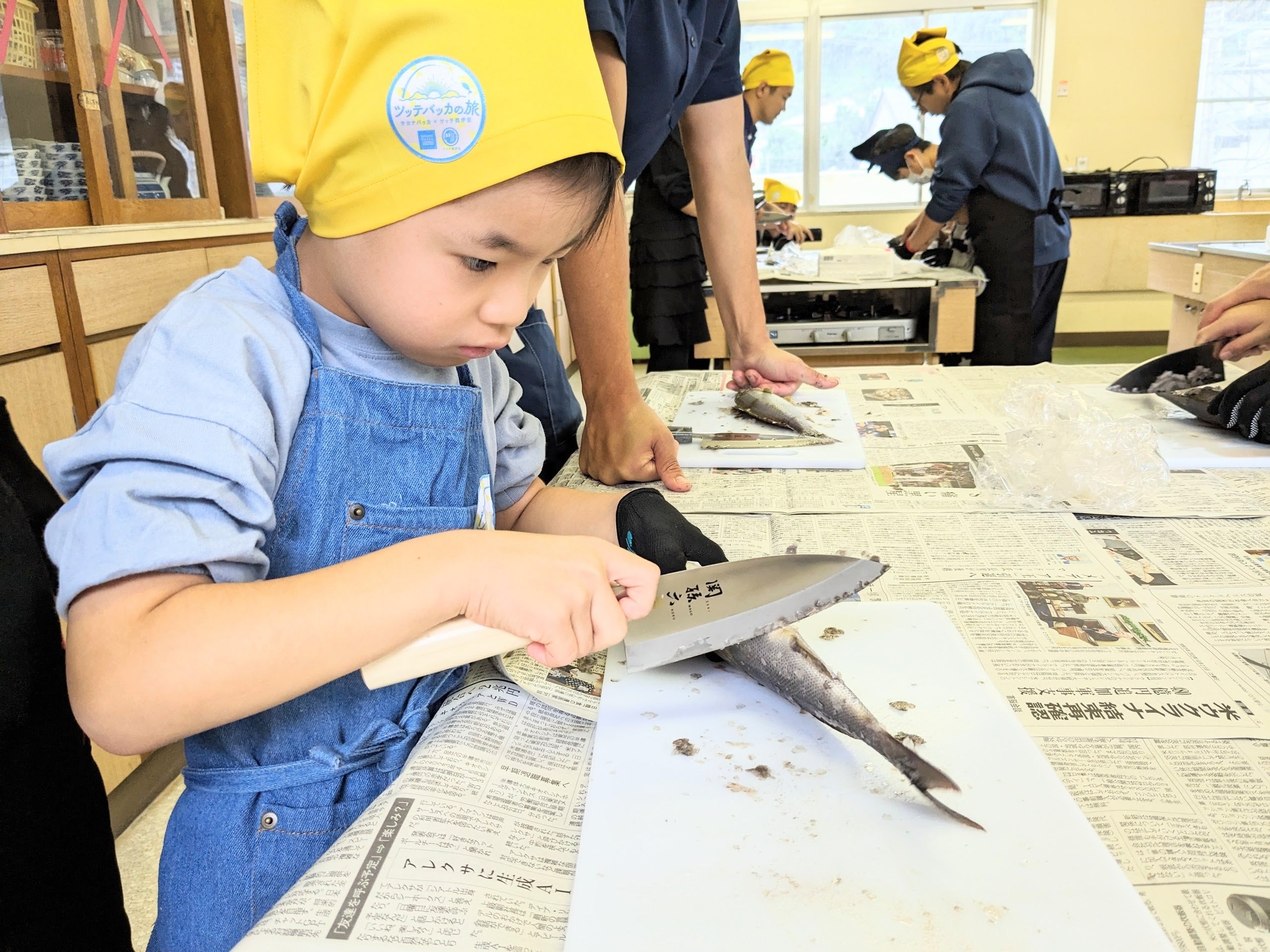 朝6時に西伊豆町・仁科漁港へ集合し、漁師さんが営む釣り船「龍海丸」に乗って海釣りに挑戦。漁師さんに釣りや鮮度処理の方法を教えていただき、漁業の楽しさ・大変さを学びました。釣った魚の約半分は産地直売所「はんばた市場」へ持ち込み、地域通貨での買い取りも体験。お子さんたちは、初めての“自分の稼ぎ”に感動しながら、さっそくお土産購入に活用していました。はんばた市場で買い取ってもらった魚は、サカナバッカ中目黒が仕入れる形で店舗へ配送。残った魚は、お子さんたちが3枚おろしに挑戦し、唐揚げにしてご家族で美味しくいただきました。(一度解散)