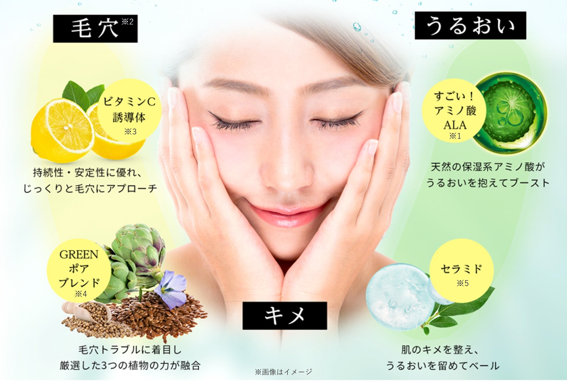 毛穴ケア(※2)の定番成分「ビタミンC誘導体(※3)」、3つの植物を融合した毛穴ケア(※2)成分「GREENポアブレンド(※4)」、独自のうるおいブースター「ALA(※1)」、うるおいをベールしキメを整える「セラミド※5」を贅沢に配合しました。