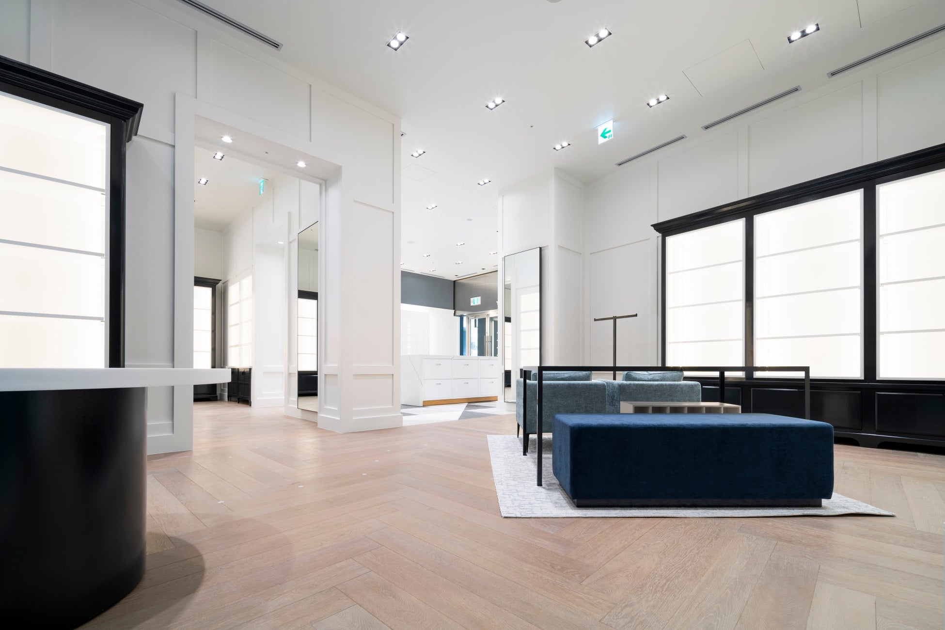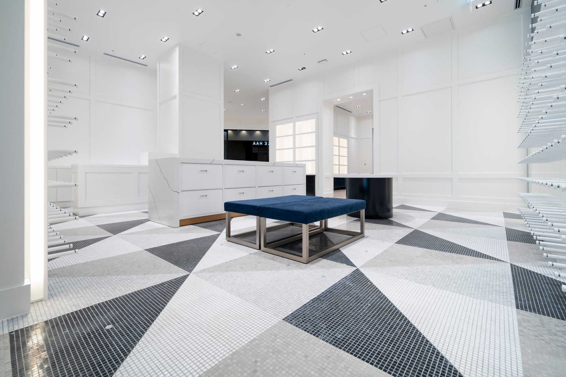 暖かみがあり木目が美しいヘリンボーンの床と、三角形のグラデーションで彩られたモザイクタイルが施された内装は、クラフトマンシップとシックでモダンな装いを演出し、100年近い歴史に根差すブランドのヘリテージを表現しながら常に前向きに進化し続けるコール ハーンの姿勢を表現しています。