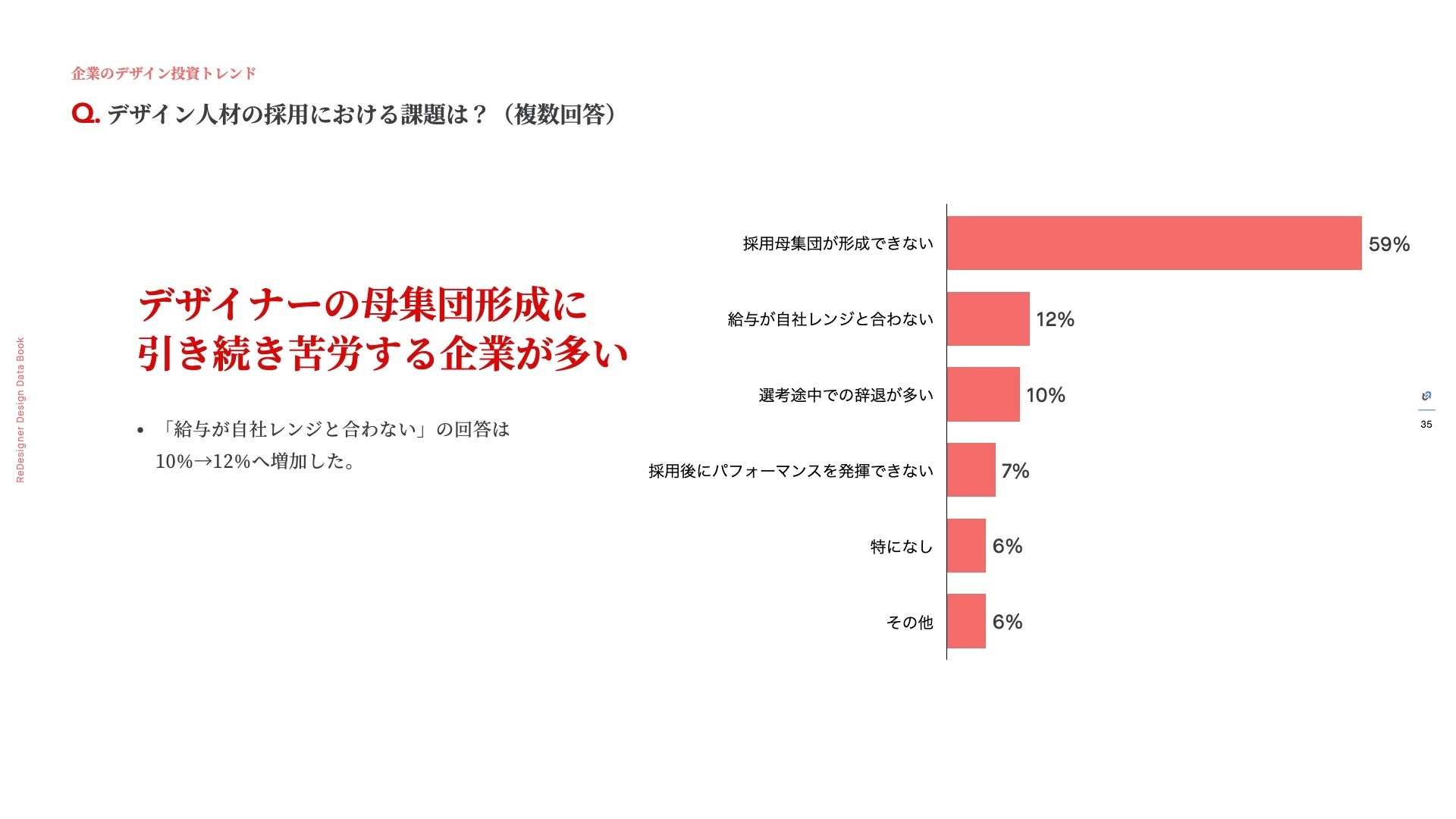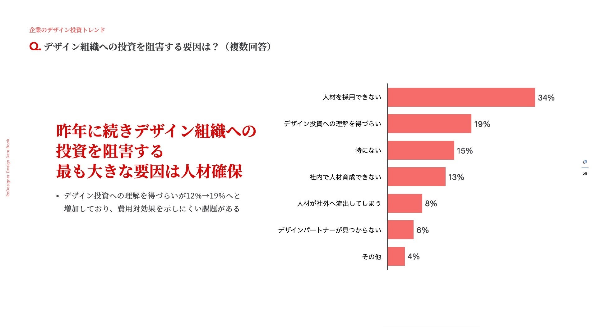 今回の調査では、回答企業の9割がデザイン投資に効果を感じる結果となっているものの、デザイン投資実施の阻害理由として3割以上(34%)の企業が「人材の採用」を要因にあげており、引き続きデザイナー人材の確保は課題となっています。