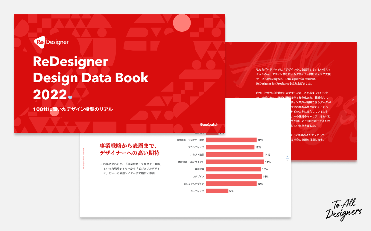 デザインの力でビジネスを前進させるデザインカンパニーの株式会社グッドパッチ(本社:東京都渋谷区、代表取締役社長:土屋尚史、証券コード:7351、以下「グッドパッチ」)が運営するデザイナー特化型キャリア支援サービス「ReDesigner(リデザイナー)」は、企業のデザイン投資やデザイナーの働き方のトレンドを可視化する年次調査「ReDesigner Design Data Book 2022」(以下、デザインデータブック)を本日公開しました。今年で4回目となる本調査では、IT・通信業界を中心に約100社の企業の人事担当者およびデザインマネージャー、ReDesignerに登録しているデザイナー約2400名などへアンケート調査を行い、回答結果をまとめました。