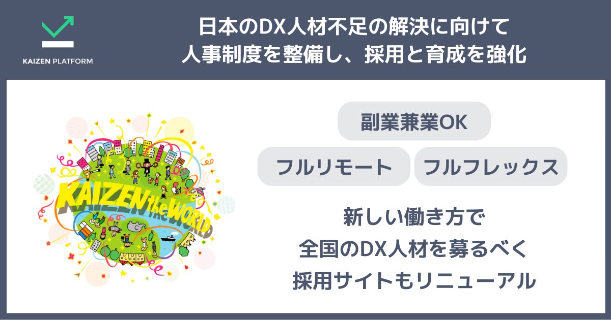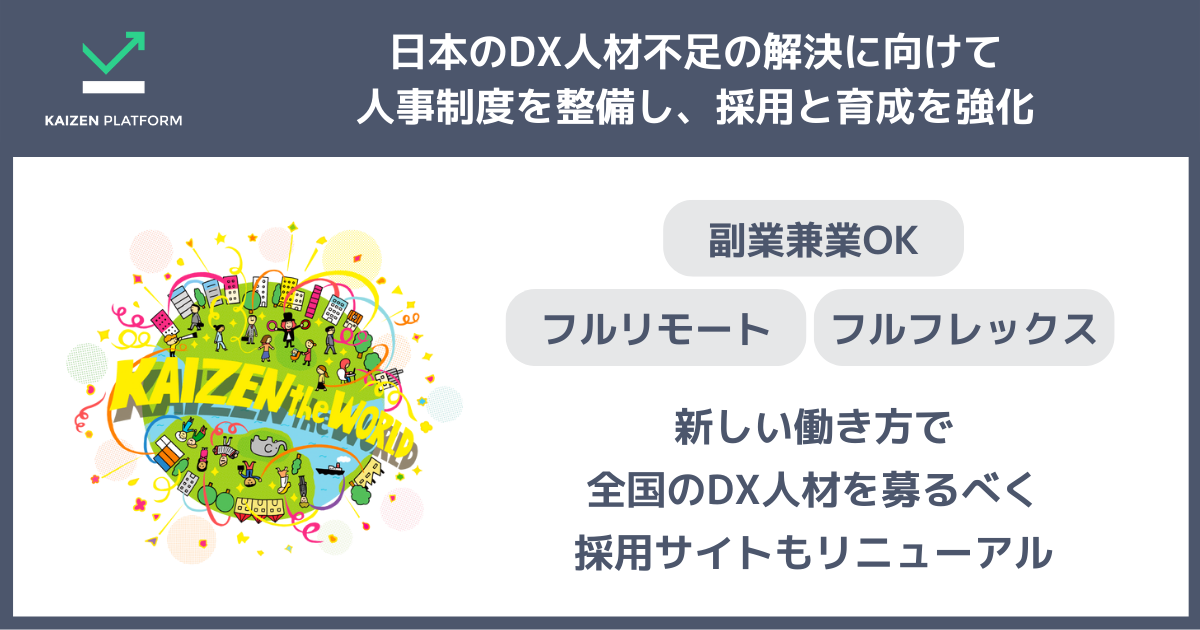 日本のDXを加速させるためにも、私たちはデジタルファースト時代に合わせた仕事・働き方を再定義し、企業内でなかなか進まない人事制度改革を率先して実現します。デジタル人材の育成から活躍の場まで、個人の価値観やスタイルを尊重し、いかんなく才能や情熱を発揮できる環境を提供することで、Kaizen Platformは「デジタルファースト時代のDX人材輩出企業」になりたいと考えています。