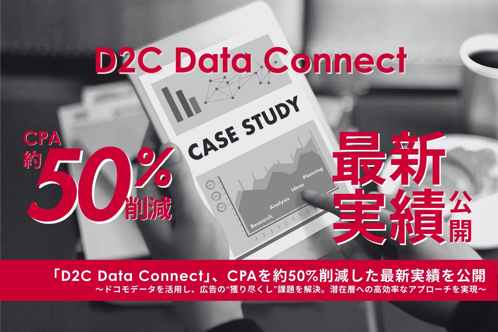 株式会社D2C(本社:東京都港区、代表取締役社長:高田 了)は、ドコモのユーザーデータを活用し大手外部プラットフォームへ配信する広告ソリューション「D2C Data Connect」において、新規顧客獲得におけるCPA(顧客獲得単価)を約50%削減した最新の広告効果実績を公開いたしました。