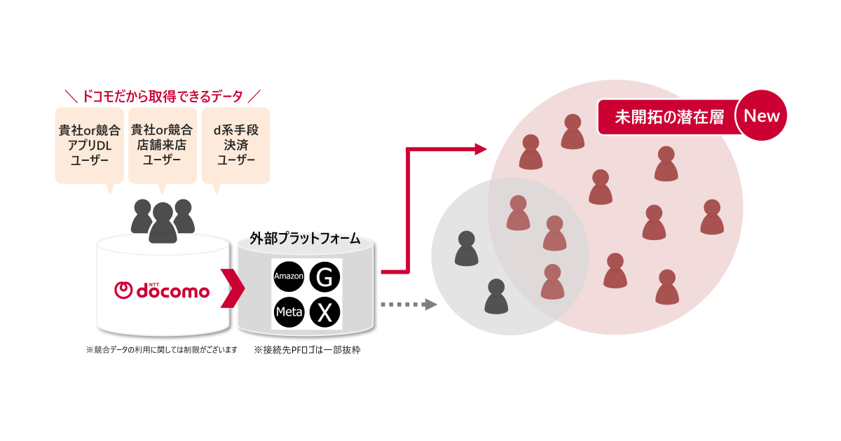本ソリューションは、株式会社NTTドコモが保有する1億超(※1)の会員基盤に基づくドコモデータを活用し、広告プラットフォームだけでは発見が難しかった「未開拓の潜在層」への高効率な広告配信を可能にするものです。