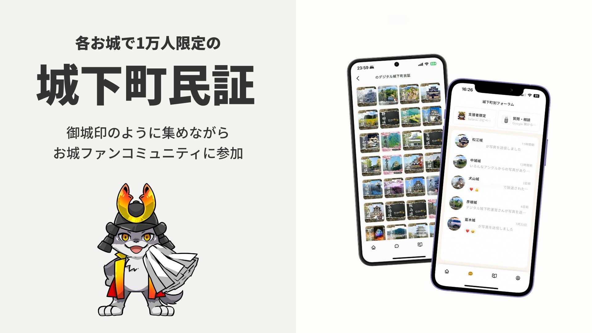 「デジタル城下町プロジェクト」は、株式会社バケットが株式会社電算システム等と連携して展開するWeb3型地域創生プロジェクトの総称です。具体的には、全国の城郭を持つ自治体等と連携し、各お城で限定1万枚の「デジタル城下町民証」を発行。お城ファンを中心とする最大1万人に城下町民証を配布し、専用SNSアプリ「デジタル城下町」でオンラインコミュニティを形成します。