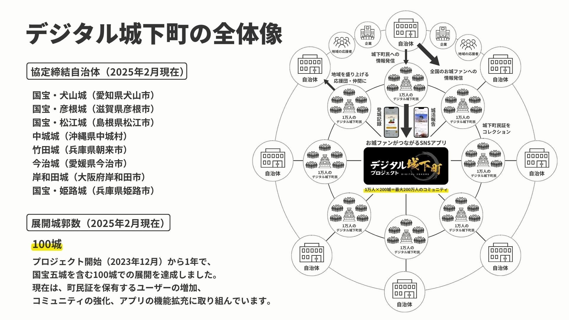 「デジタル城下町プロジェクト」は、2023年12月に国宝 犬山城(愛知県犬山市)でスタートした「犬山デジタル城下町」を皮切りに、わずか1年で国宝五城を含む100城の登録が決定。国内各地の自治体と連携しながら展開する、広域型の地域創生プロジェクトです。