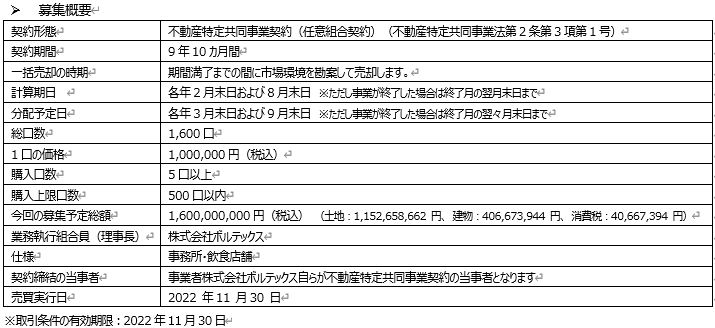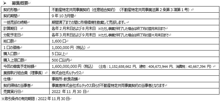 本商品は、取引の概要をまとめたものであり、詳細は別途、不動産特定共同事業契約の成立前交付書面をご確認ください。