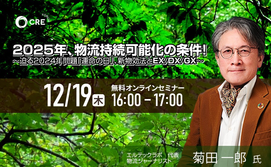 株式会社シーアールイー(本社:東京都港区、代表取締役:亀山忠秀、以下「CRE」)は、荷主企業・物流部門 、物流企業を対象にした無料セミナー『2025年、物流持続可能化の条件!~迫る2024年問題「運命の日」、新物効法※1とEX/DX/GX~』を2024年12月19日(木)16:00~17:00オンラインにて開催いたします。