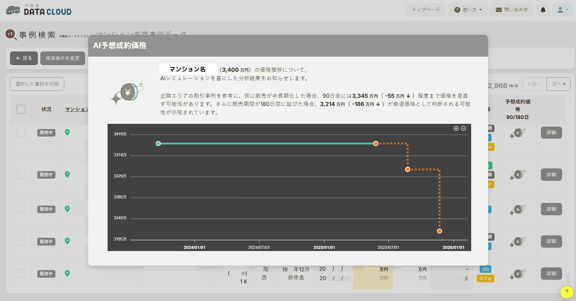 本機能は、販売中のマンションに対して、90日後/180日後の成約価格をAIが予測するもので、物件ごとの特性を考慮した高精度な価格予測が可能になります。