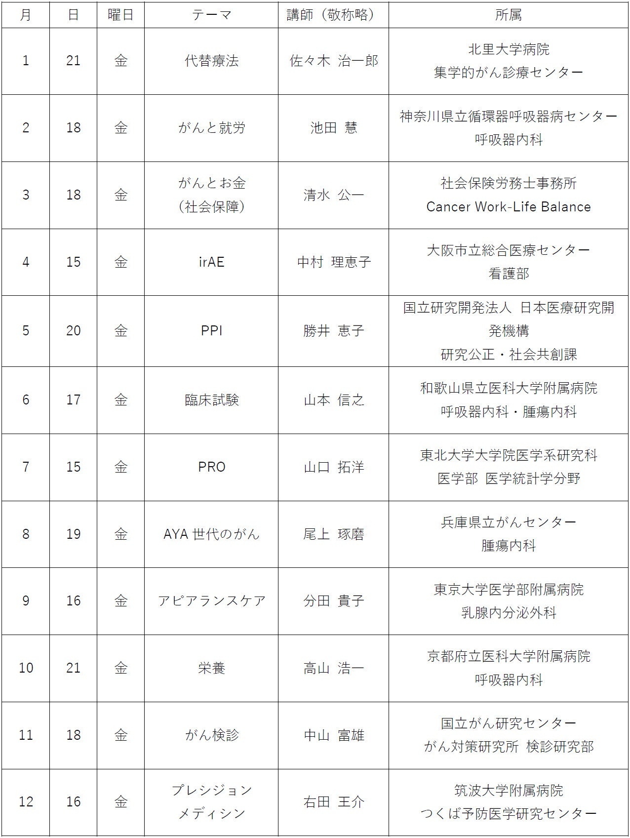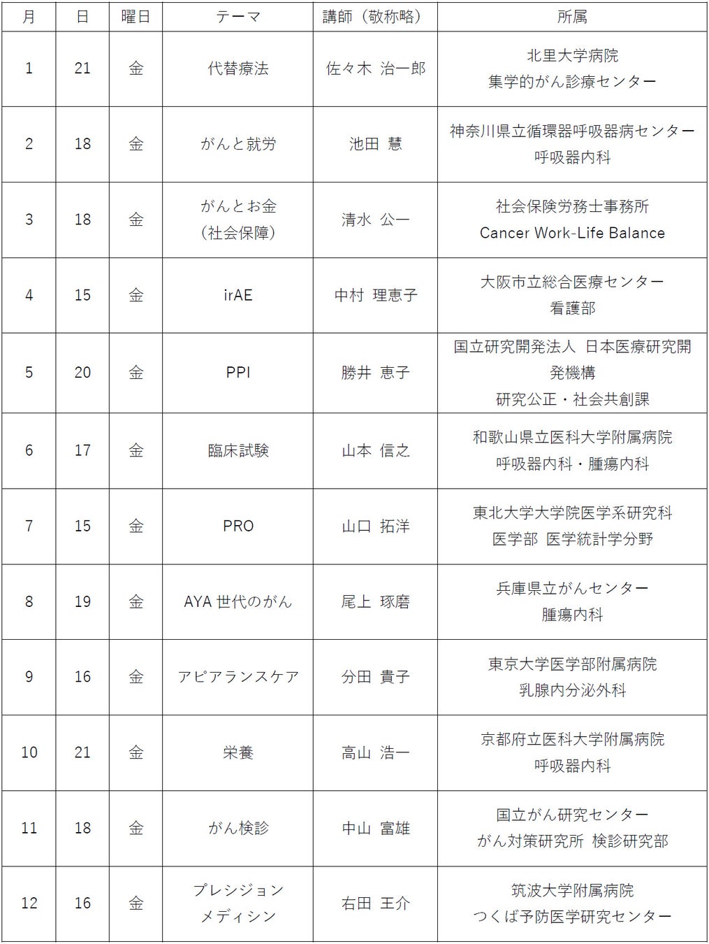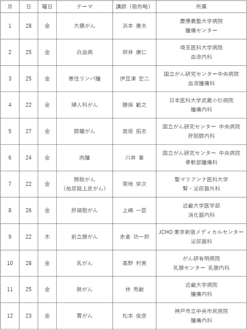 ※各セミナーは予告なく、変更する場合がございます。最新の情報、講師、テーマについては、随時、がん情報サイト「オンコロ」ホームページ(https://oncolo.jp/)、SNS等にて公開いたします。