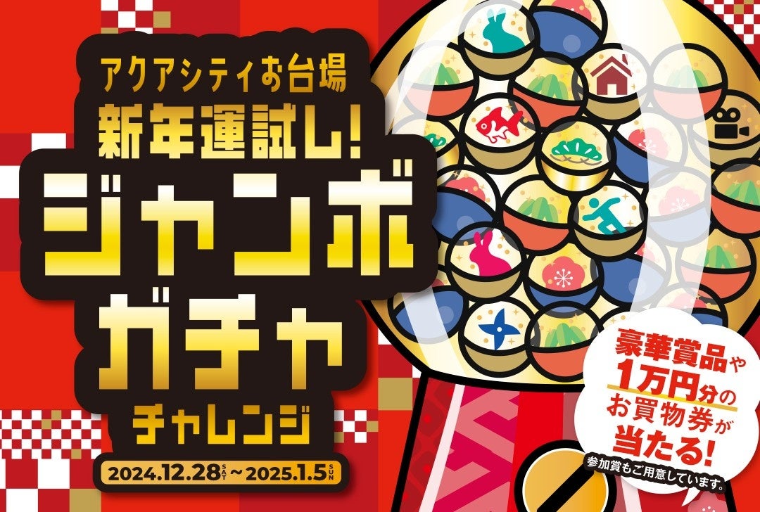 対象期間中、アクアシティお台場でのお買上げレシート4,000円(税込/合算不可)ごとに1回、最大5回までジャンボガチャにご参加いただけます。さらに、アクアシティお台場公式Instagramアカウントのフォロー画面のご提示で、もう1回チャレンジ!人気ゲーム機などの豪華賞品や、アクアシティお台場で当日からご利用いただけるお買い物券などが当たります。何が当たるか?ワクワク!ドキドキ!のジャンボガチャチャレンジにご参加ください。