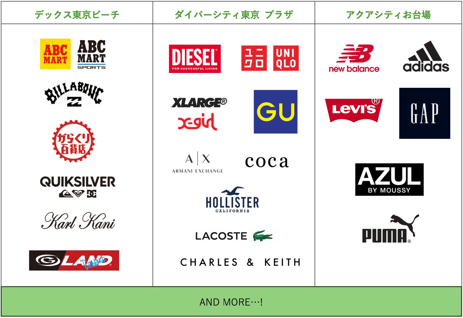 各施設からの主な参加店舗は下記の通りです。お気に入りの冬アイテムを是非お台場でお買い求めください。