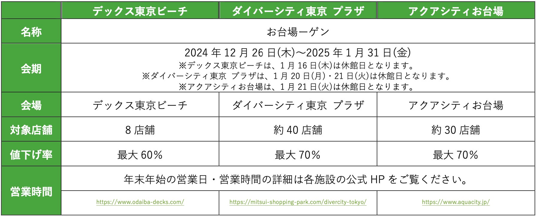デックス東京ビーチ(運営:東急不動産SCマネジメント株式会社)、ダイバーシティ東京 プラザ(運営:三井不動産商業マネジメント株式会社)、アクアシティお台場(運営:三菱地所プロパティマネジメント株式会社)の大型商業施設3施設にて、お台場の年末年始を盛り上げるべく、2024年12月26日(木)より、期間限定で合同バーゲン「お台場ーゲン」を同時開催します。