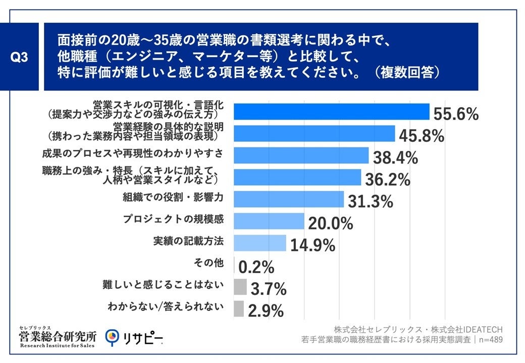 Q1で「書類選考には関わらない」以外を回答した方に、「Q3.面接前の20歳〜35歳の営業職の書類選考に関わる中で、他職種(エンジニア、マーケター等)と比較して、特に評価が難しいと感じる項目を教えてください。(複数回答)」(n=489)と質問したところ、「営業スキルの可視化・言語化(提案力や交渉力などの強みの伝え方)」が55.6%、「営業経験の具体的な説明(携わった業務内容や担当領域の表現)」が45.8%、「成果のプロセスや再現性のわかりやすさ」が38.4%という回答となりました。