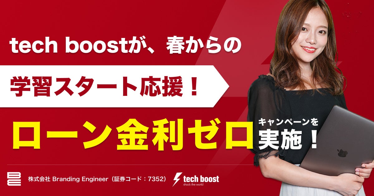 株式会社Branding Engineer(所在地:東京都渋谷区、代表取締役CEO:河端保志、代表取締役COO:髙原克弥、証券コード:7352、以下Branding Engineer)は、運営するプログラミングスクールtech boost(以下、tech boost)にて、2022年1月14日から2月20日までのご契約者様を対象に、ローンをご利用して入学いただく方向けに金利ゼロキャンペーンを実施することをお知らせいたします。
