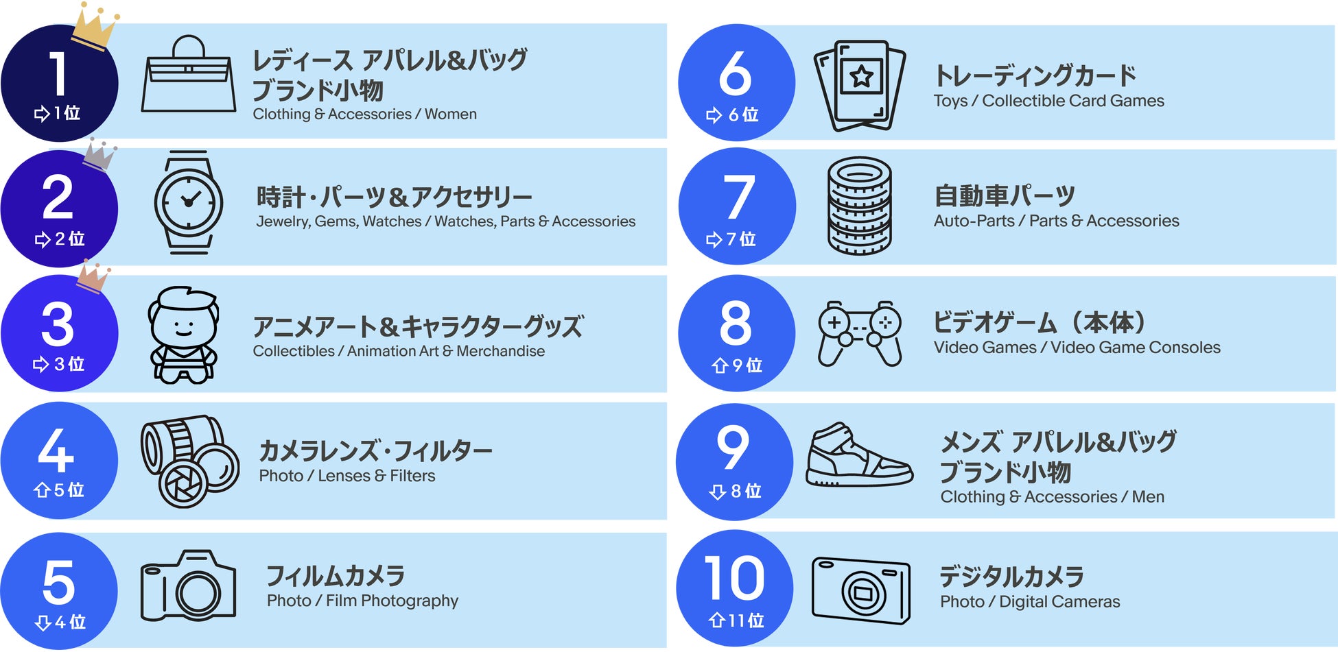 年が変わってもTOP10の顔触れに大きな変化はなく、9位までが前期と同じカテゴリーが並びました。1位は女性向けのブランド品、2位に腕時計・アクセサリー。3位にアニメグッズとなり2022年第1四半期から5期連続で変わらぬTOP3となりました。前々期から12位→11位と成長していたデジタルカメラは今期も著しい伸びを見せ、ついにTOP10入りを果たしました。