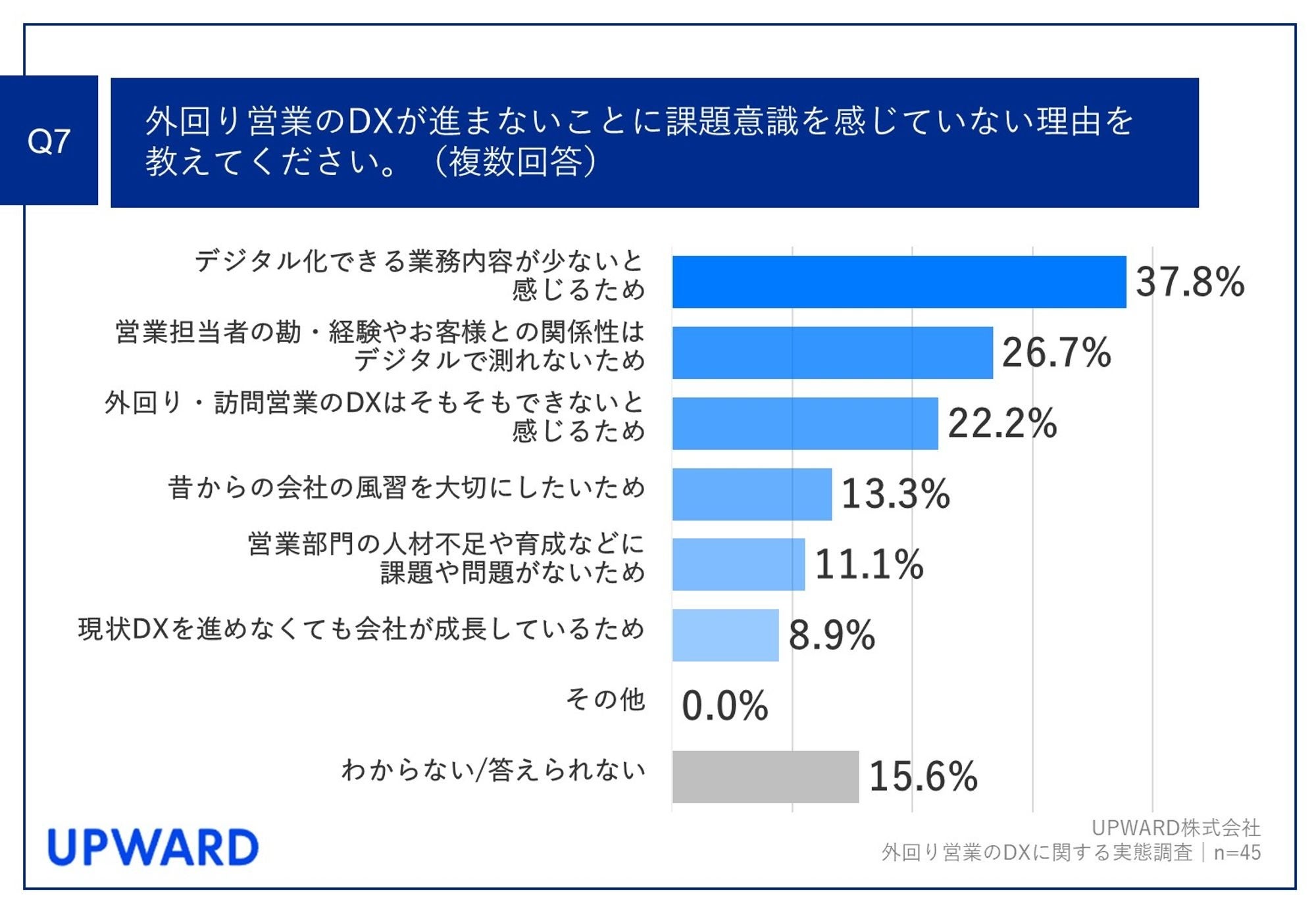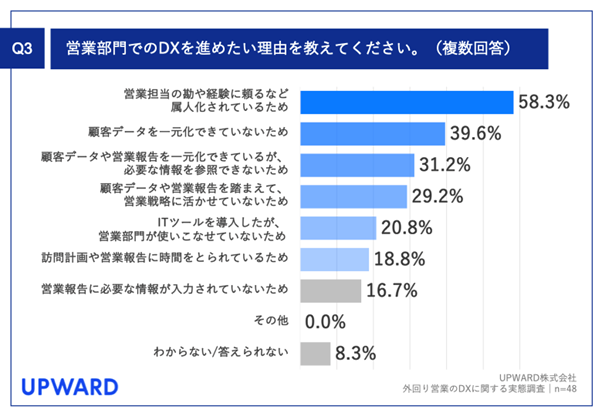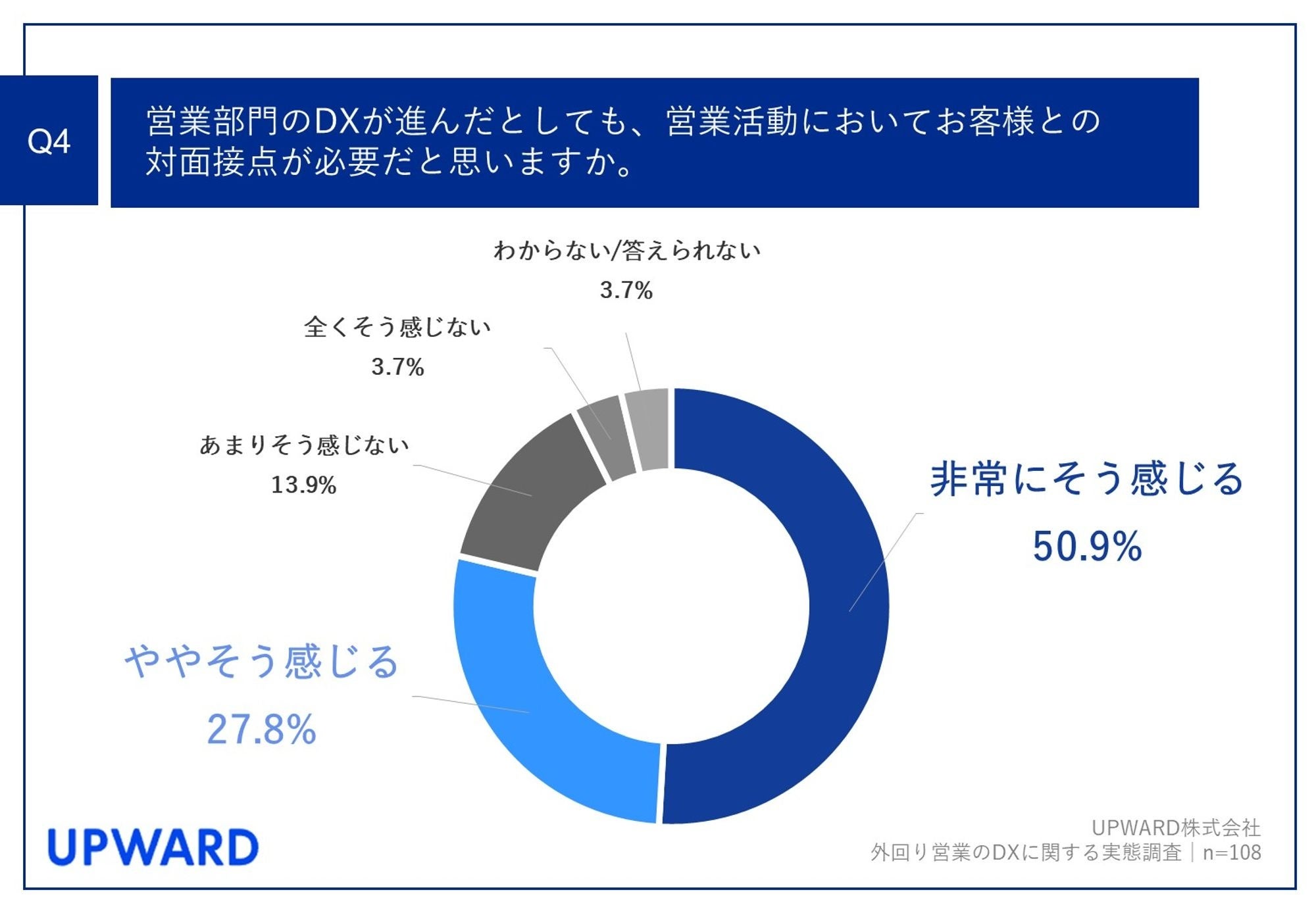 UPWARD株式会社(本社:東京都千代田区、代表取締役社長 CEO:金木 竜介)は、外回り営業を行っている企業の経営者108名を対象に、外回り営業のDXに関する実態調査を実施しましたので、お知らせいたします。