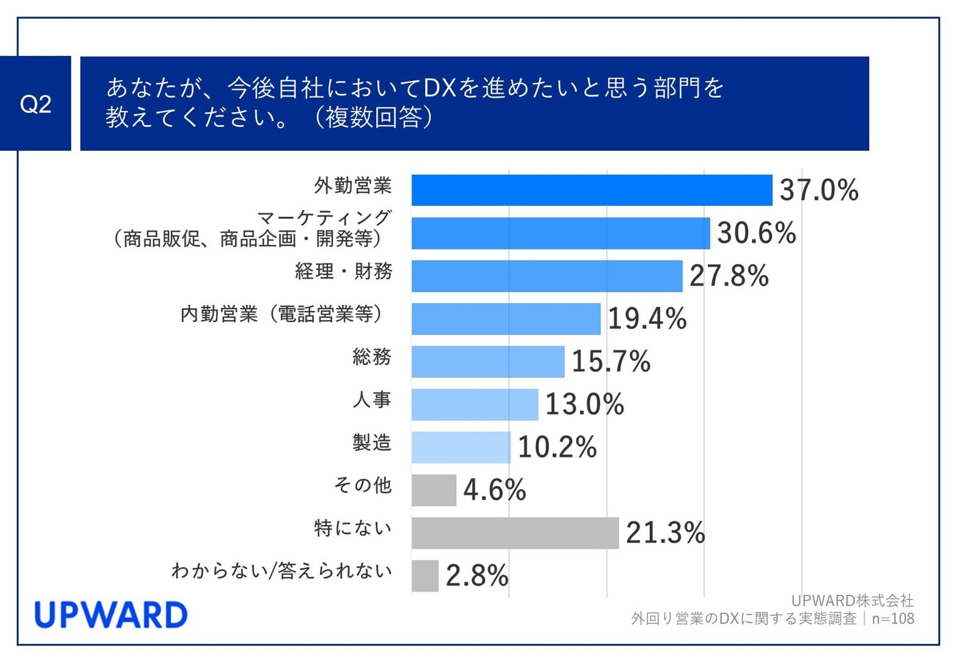 「Q2.あなたが、今後自社においてDXを進めたいと思う部門を教えてください。(複数回答)」(n=108)と質問したところ、「外勤営業」が37.0%、「マーケティング(商品販促、商品企画・開発等)」が30.6%、「経理・財務」が27.8%という回答となりました。