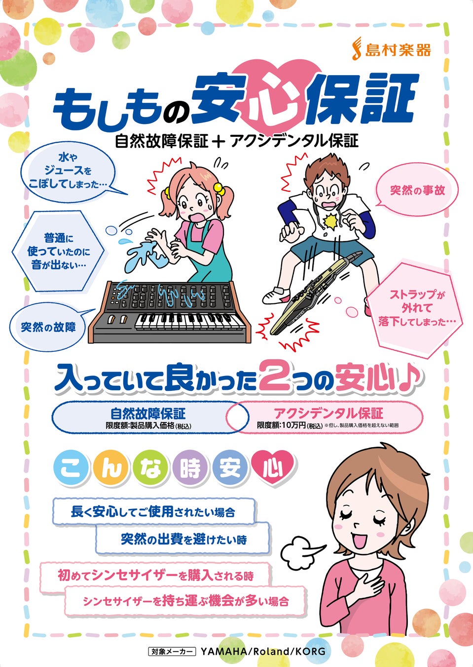 長く安心してご使用されたいお客様はもちろん、初めてシンセサイザーをご購入される場合や持ち運びの機会が多い場合、また突然の出費を避けたいときなどにも安心のサービスとなっておりますので、シンセサイザーのご購入を予定しているお客様は、ぜひこの「もしもの安心保証」も併せてご検討ください。