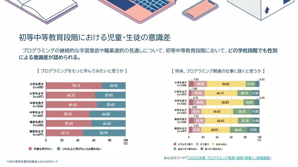 みんなのコードは、今後も、ジェンダーギャップの解消に向けた取り組みを続け、テクノロジー分野における多様性を向上させることで、新しい価値を創出し、子どもたちにとってより良い未来を築くことに貢献してまいります。