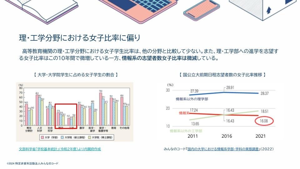 世界経済フォーラムが発表した「Global Gender Gap Report 2023」によると、日本のジェンダーギャップ指数は125位であり、ジェンダー平等の観点で著しく立ち遅れています。また、 「Society 5.0の実現に向けた教育・人材育成に関する政策パッケージ」(内閣府)によると、STEM分野入学者女性比率がOECD加盟国で最下位であることから、日本において、テクノロジー分野のジェンダーのバランスに大きな課題があることが分かります。