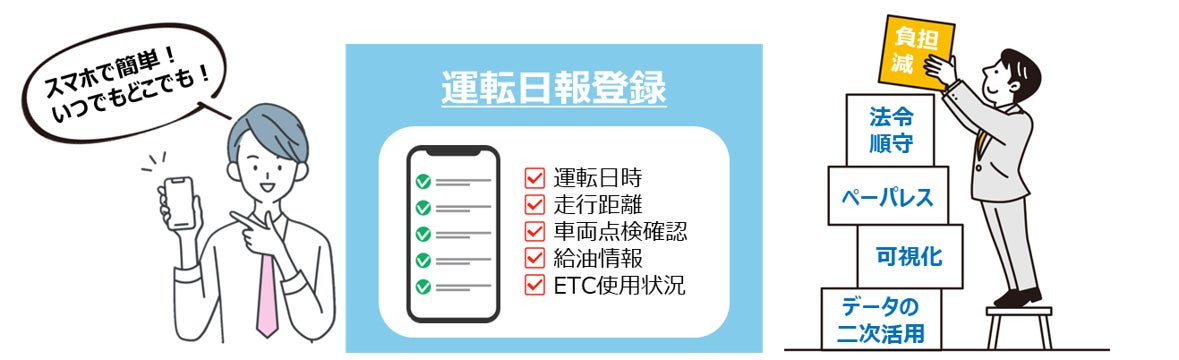 安全運転管理者設置事業所(※)において、業務で車両を運転する際は、「運転前後の酒気帯び確認」と共に「運転日報」についても、その記録と管理が義務付けられています。『デジタル点呼マネージャー・スマート』は、これまで提供していたアプリとアルコール検知器を自動連動させた「アルコールチェック」機能に加え、行先や走行距離や運転時間・給油情報などを記録する「運転日報」機能を追加し、クラウドの管理画面より参照・出力が可能となりました。これにより業務での車両利用における情報をクラウドで一元的に管理することができるため、ペーパレス化をはじめ管理業務の負荷低減・ガバナンス強化に大きく貢献します。