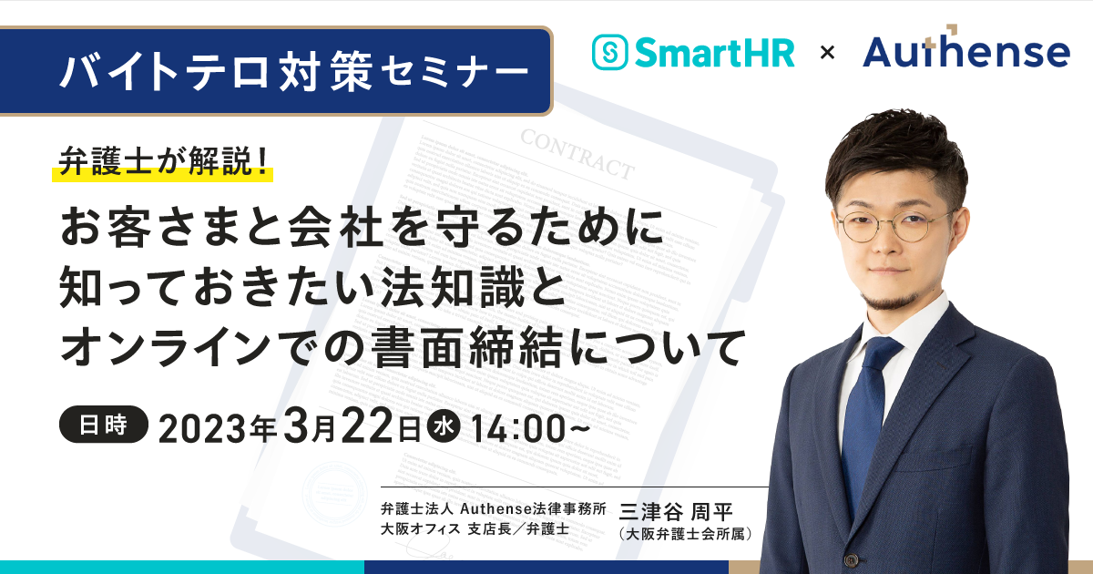 Authense法律事務所(東京都 港区)は、3月22日(水)に「【バイトテロ対策セミナー】弁護士が解説!お客さまと会社を守るために知っておきたい法知識とオンラインでの書面締結について」と題したセミナーを開催いたします。今回は、人事・労務業務の効率化と、組織の活性化や組織変革の推進を実現する各種機能を提供する株式会社SmartHRとタッグを組み、法律家目線でおさえておきたいポイントや、誓約書等の文書をオンラインで締結するシステムについて、くわしく解説いたします。