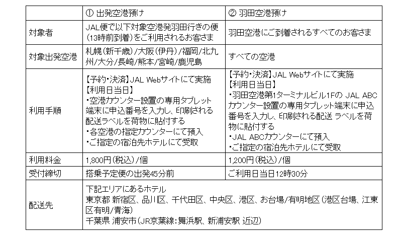 (*) 2021年10月14日付けエリアニュース『【関西】(共同リリース)大阪(伊丹)発東京(羽田)行きの便で、滞在先ホテルまで手ぶらで移動できる手荷物当日配送サービスの実証実験を実施』 https://press.jal.co.jp/ja/areanews/release/202110/006272.html 他参照