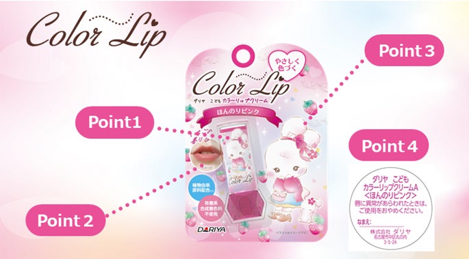 株式会社ダリヤ(本社:名古屋市中区、代表取締役社長:野々川 純一)が展開する、お化粧品への憧れとおしゃれ意識を同時に満たす「ダリヤ こどもカラーリップクリーム」がリニューアル!カラーは「ほんのりピンク」と「ほんのりレッド」の2種類。有機系合成着色料不使用のやさしく色づくリップクリームです。植物由来原料(※1)配合。うるおいを与え、荒れ・乾燥によるカサつきを防ぎ、くちびるをしっかり保護します。メルヘンな世界観の新キャラクターと、コスメ感あふれるデザインとジュエリーのようなキラキラ容器が、おしゃれ気分をくすぐります。また、容器の底に名前が書けるので、お友達のリップと間違えません。お子さまの大好きないちごの香り。