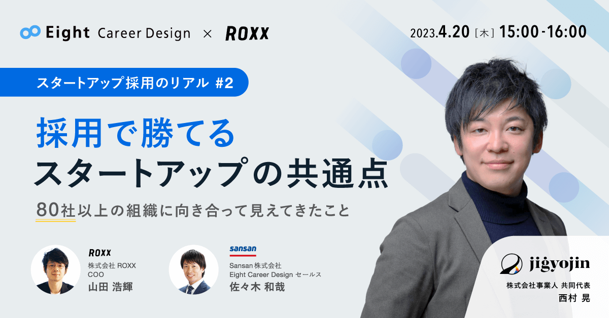 株式会社ROXX(本社:東京都新宿区、代表取締役:中嶋汰朗、以下ROXX)が開発・提供する、オンライン完結型リファレンスチェックサービス『back check』は、2023年4月20日、オンラインセミナー『採用で勝てるスタートアップの共通点 〜80社以上の組織に向き合って見えてきたこと〜』を開催いたします。株式会社事業人の共同代表を務める西村晃氏をお招きし、「組織成長のための採用競争に勝ち続けているスタートアップの共通点」をテーマに講演いただきます。加えて後半では、Sansan株式会社 Eight事業部 Eight Career Design セールス 佐々木和哉氏をお迎えし、ROXX 取締役COOの山田と3名でのパネルディスカッション形式で、「スタートアップ人事に求められるもの」や「スタートアップが採用に勝つためのMUST条件」などの観点からも議論を深めます。