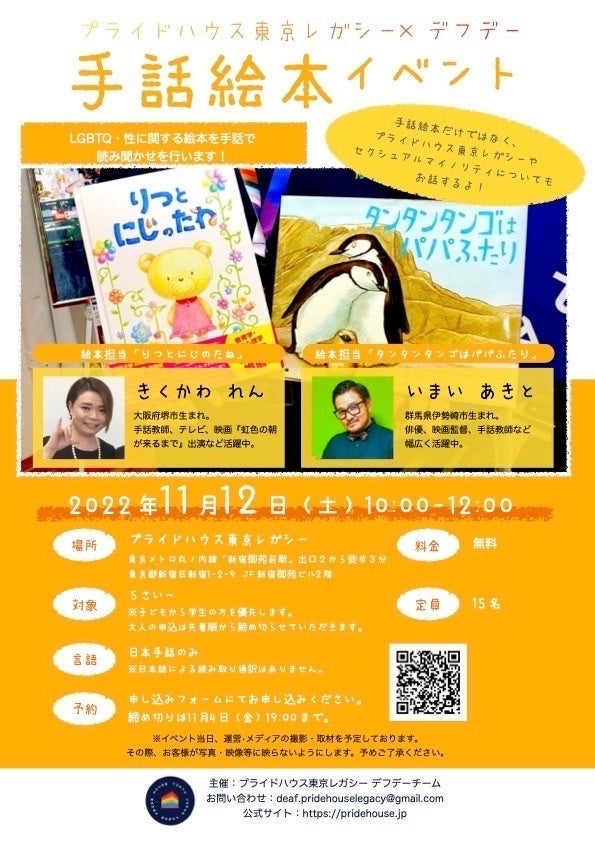 多様な性のあり方を通して、ろうLGBTQ+を知っていただくイベントを11月12日(土)に開催します。ろう業界で有名な菊川れんさんと今井彰人さんをお招きし、手話で絵本読み聞かせを行います。