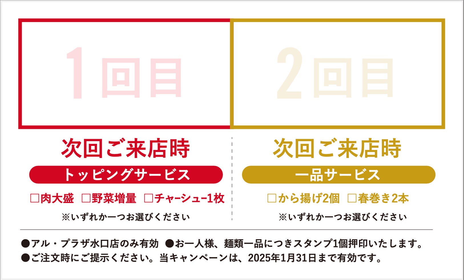 アル・プラザ水口店限定の特典付きスタンプカードを配布し、2回目までのご来店でお得なサービスが受けられます。