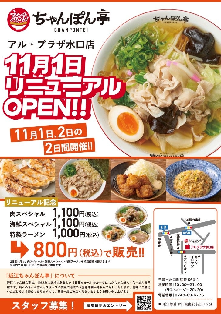 「近江ちゃんぽん亭 アル・プラザ水口店」リニューアルオープン!感謝の2日間、特別価格でお届け