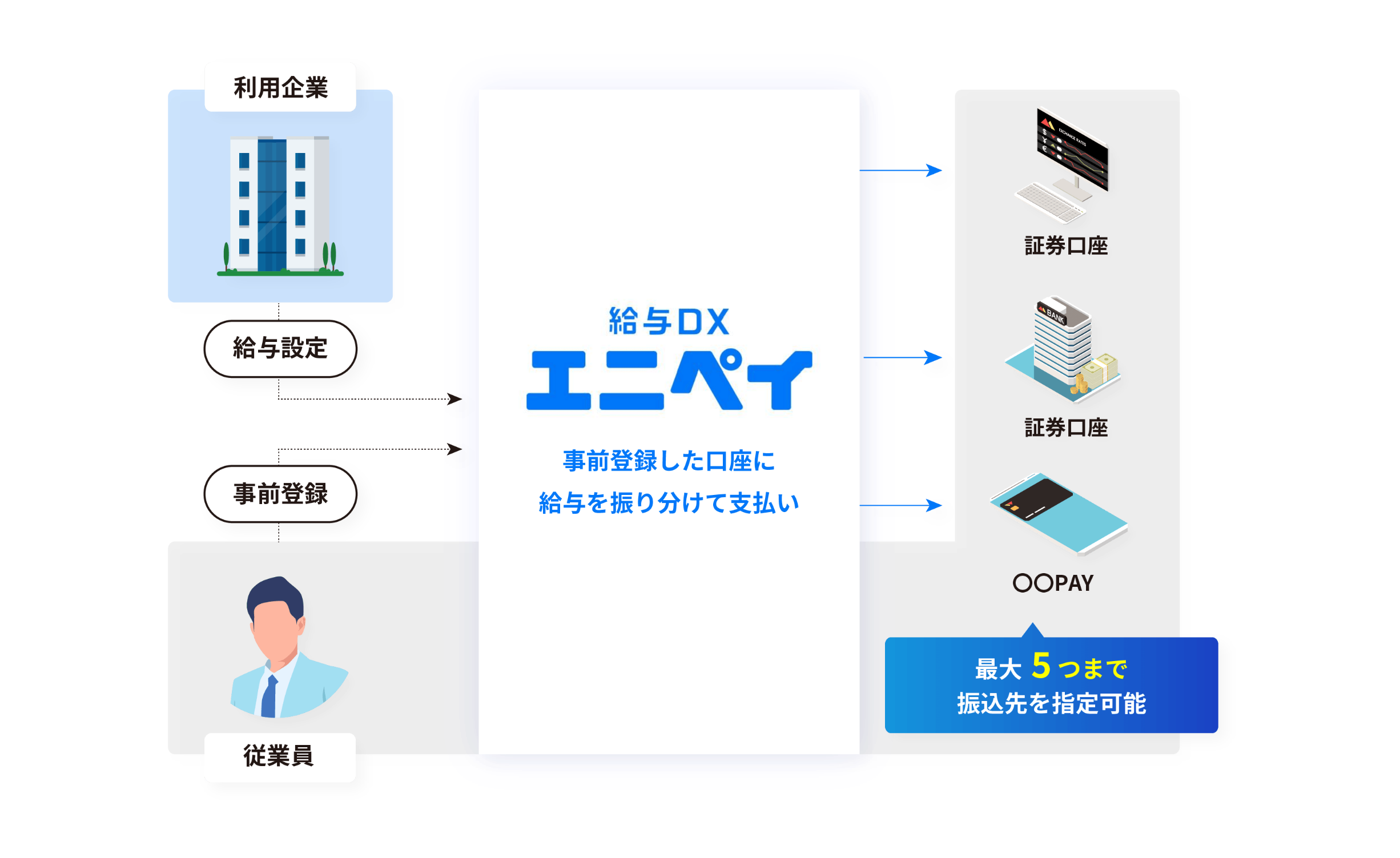 エニペイは、資金移動業者の口座への給与振り分けが可能になる他、給与を円での金額指定だけでなく、%での振り分け機能を実装しており、従業員は給与額が変わっても都度「証券口座にいくら」「銀行口座にいくら」と指定する必要がなくなります。