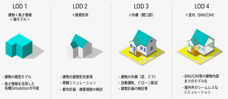 建物等の地物の表現に関して、そのモデルの「詳細さの度合い(詳細度)」であり、その利用や可視化の目的に応じて分類したモデリングの仕組み。
